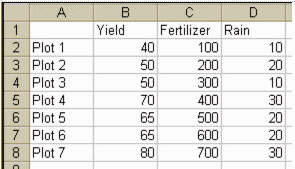 5. If, when selecting for copying, you did not include the space to the left of "Yield," fix your spreadsheet after pasting by moving the first row variable names so that they are in columns B, C, and D, leaving cell A1 blank. The diagram above to the right shows how it should look.