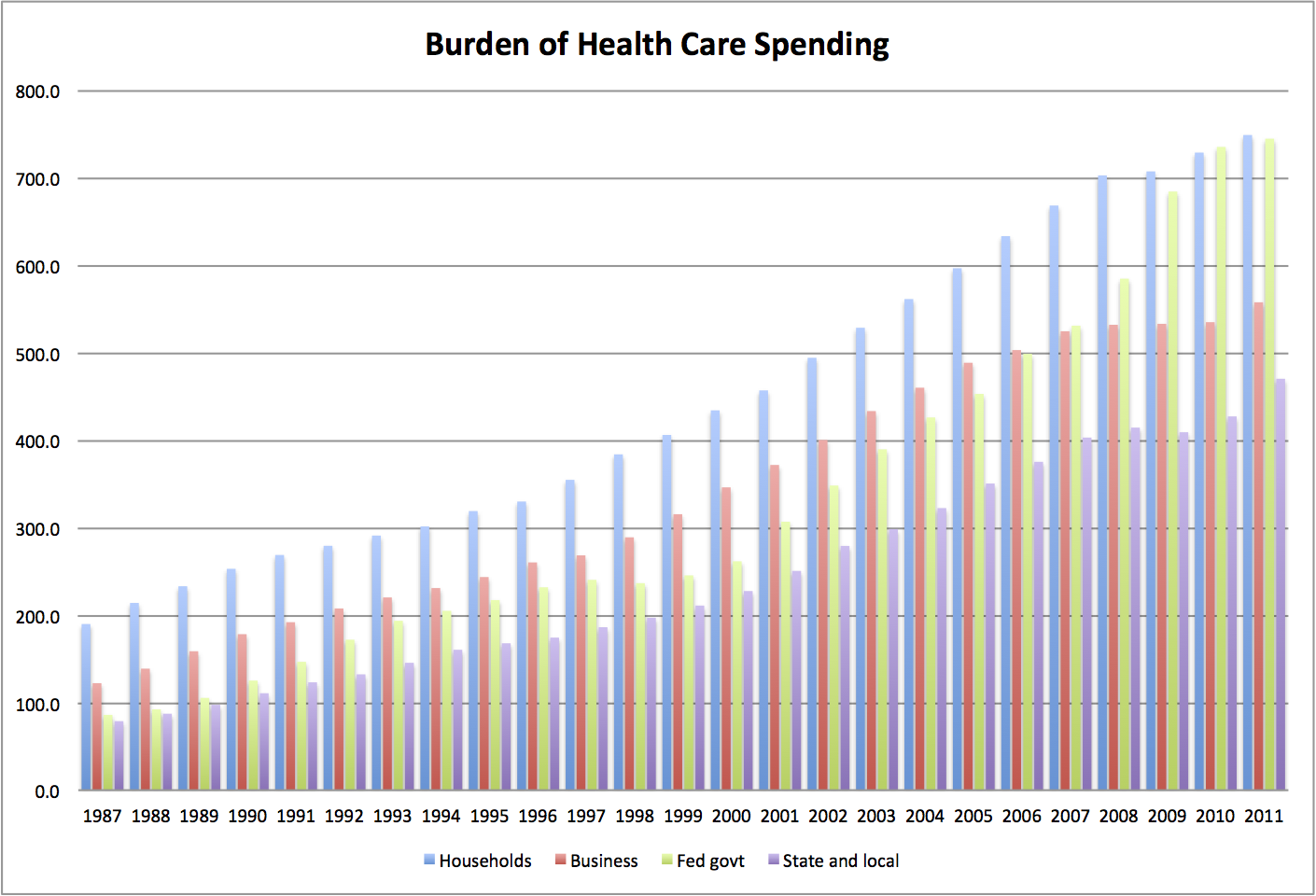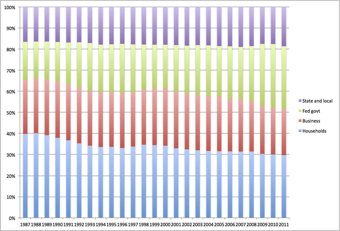 The government share rose pretty steadily over this time period, from 32% in 1987 to 45% in 2011. All but two of the 13-point increase was Federal.