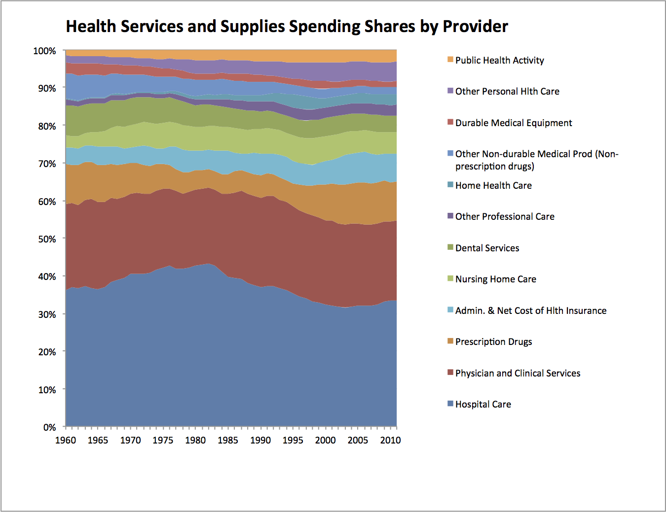 This graph shows, for the years 1960-2011, relative shares of the health health services and supplies dollar. That is everything in the preceding graphs except research and construction. I put public health at the top of the graph. That lets you see how public health's small share rose from 1960 to 2000, then levelled off pretty much. Administrative cost's share rose from 2000 to 2007, but fell in 2008 and 2009. Nursing home care grew rapidly in earlier years, but recently other sectors have grown faster. Home health care's has grown. Prescription drugs got left behind a bit in the 1960's and 1970's, but have since more than come back. Physicians generally maintained their share. Hospitals' share rose from 1960 to 1983. From 1983 to 2001, hospitals' share fell. This does not mean hospitals were getting less money. The preceding graph shows that hospital care was growing, by a lot. It just means that other parts of health care grew faster, from 1983 to 2002. Since 2003, the hospitals' share has been creeping up. |