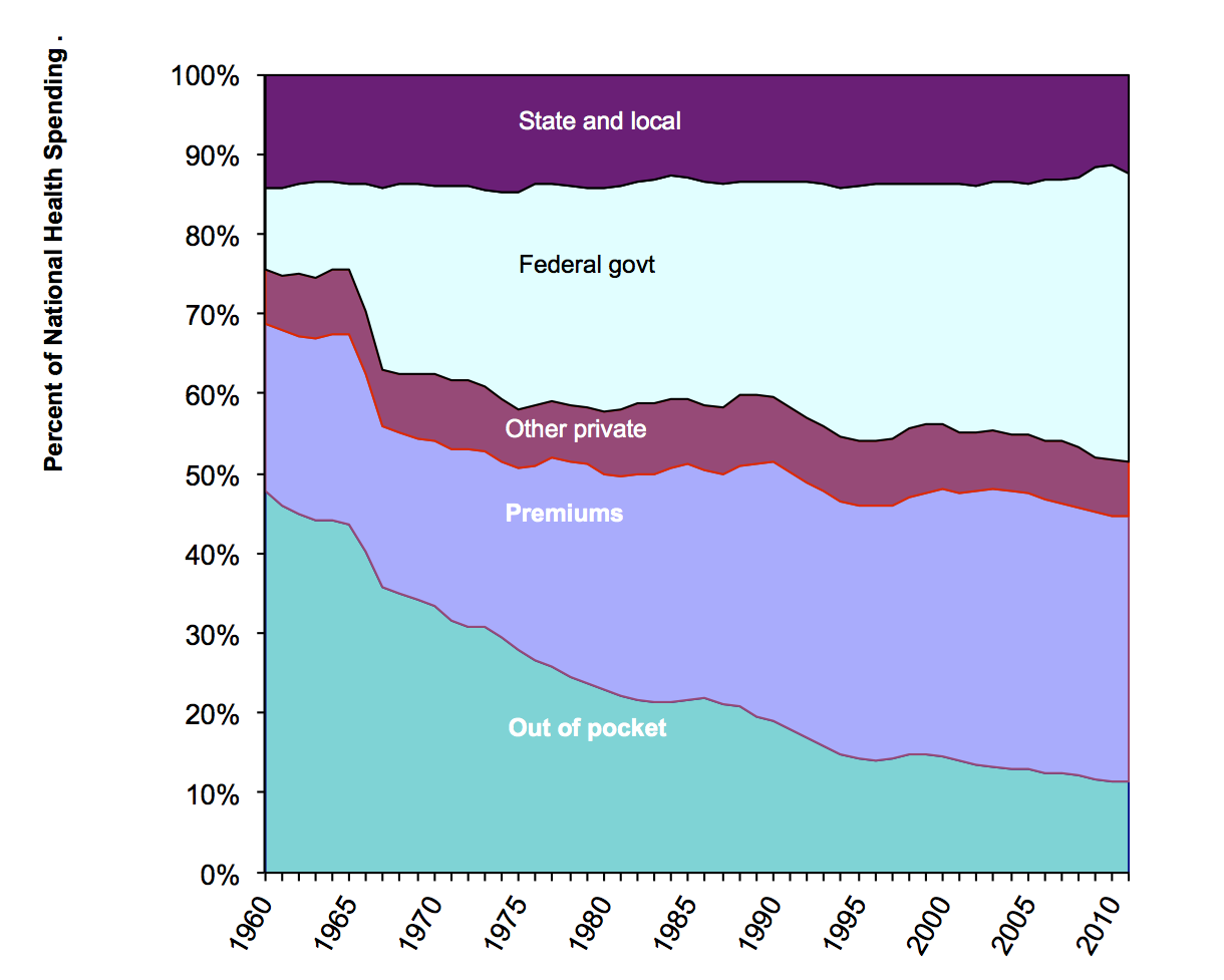 Out-of-pocket spending's share declined from nearly half of health spending in 1960 to just over one dollar in nine in 2011. Deductibles and copayments are getting higher, which means more out-of-pocket spending, but public spending has growing faster. Insurance premiums as a proportion of health care spending has been falling gradually since 2003, down to 33% in 2011.