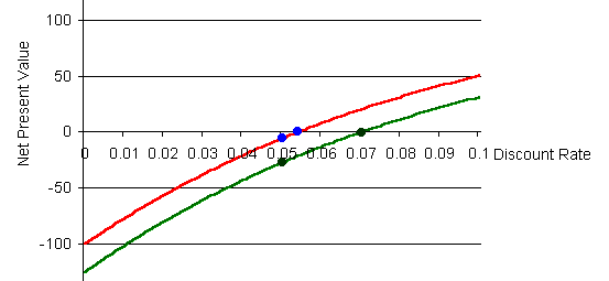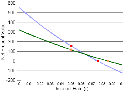 In this example, our two measures, the net present value at r=0.05 and the internal rate of return, tell us the same thing. They both say the second investment is better. A look at the graph above confirms that the second investment is better at all discount rates, so it is fair to say that the second investment is unequivocably better than the first.