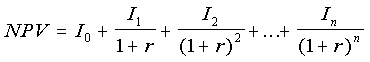 The net present value (NPV) of a whole income stream is the sum of these present values of the individual amounts in the income stream. If we still assume that income comes or goes in annual bursts and that the discount rate will be constant in the future, then the NPV has this formula: