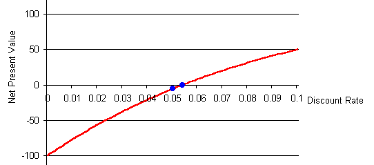 rate of 0.05 (5%). The right red dot shows the internal rate of return,