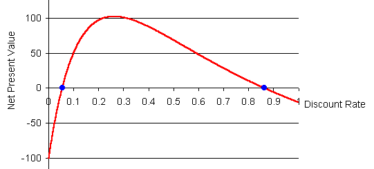 My use of the terms "switch" and "reswitch" refers to the reswitching controversy of the 1960's. This was between economists in Cambridge, England, and Cambridge, Massachusetts, over whether capital markets can be analyzed just like other commodity markets. The English economists, led by Joan Robinson, argued that capital markets were special because of the possibility of reswitching, which raises basic questions about the standard view that the return to owning capital is a society's reward for abstaining from consumption.The oldest discussion of this tutorial's issues that I have found in the economics literature is Lorie JH, Savage LJ, "Three Problems in Capital Rationing," Journal of Business, Vol. 28, October 1955.Some economists would say that only the second of our IRR's is the true IRR, by defining the IRR as the place where the NPV is 0 and where the NPV is falling. The problems with that are: (1) this distinction is usually lost in practice, and (2) by making the pattern of costs and profits more complex, I can make up an investment that has multiple discount rates where the NPV is 0 and the NPV is declining.